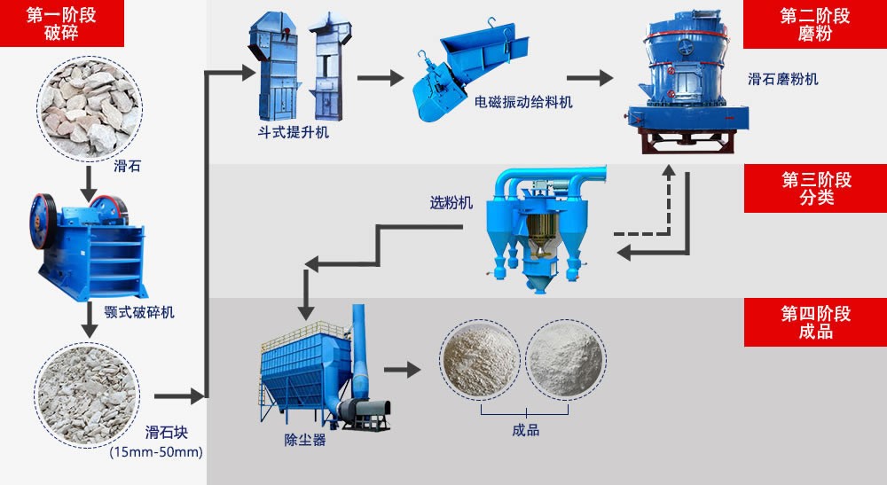 時產(chǎn)150噸滑石磨粉生產(chǎn)線工藝流程:
