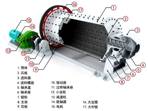 棒磨機工作時,由電機通過減速機及周邊大齒輪減速傳動或由低速同步電機直接通過周邊大齒輪減速傳動,驅(qū)動筒體回轉(zhuǎn)。筒體內(nèi)裝有適當?shù)哪サV介質(zhì)-鋼棒。磨礦介質(zhì)在離心力和摩擦力的作用下,被提升到指定高度,呈拋落或泄落狀態(tài)落下,被磨制的物料由給礦口連續(xù)的進入筒體內(nèi)部,被運動的磨礦介質(zhì)所粉碎,并通過溢流和連續(xù)給礦的力量將產(chǎn)品排出機外,以進行下一段工序作業(yè)